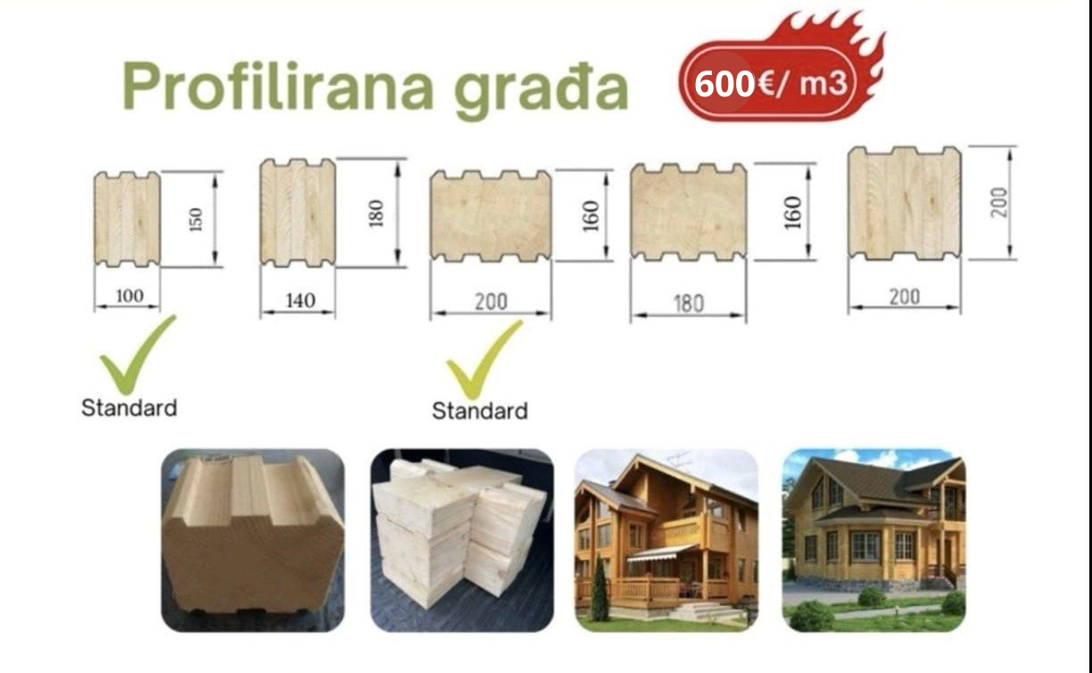 Naši strojno obrađeni trupci i profilirana greda izrađuju se od ukrajinske smreke, zbog čega je materijal ekološki čist i pozitivno utječe na mikroklimu u kući. Sva drvena građa proizvodi se na suvremenoj opremi, pa su svi elementi kalibrirani i prilagođeni potrebnoj dimenziji.